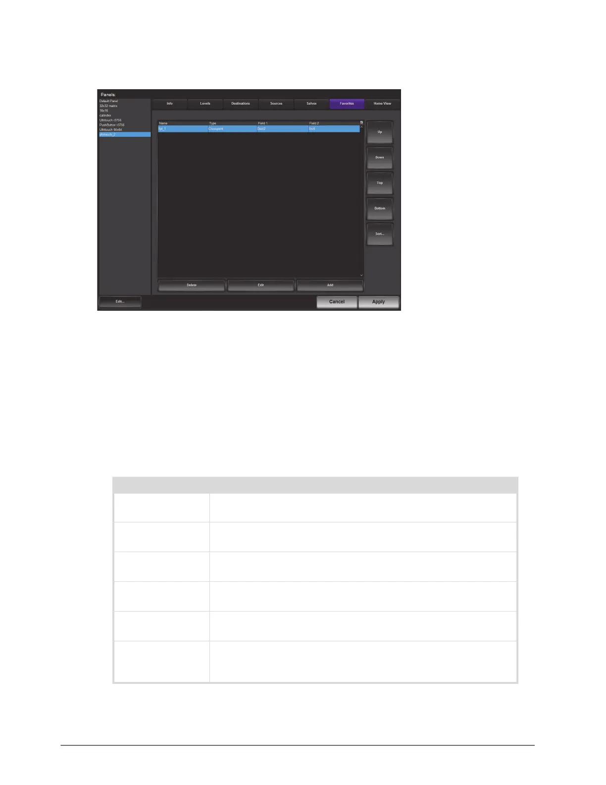 Favorites Adds a window of configurable sources, destinations, crosspoints, groups,