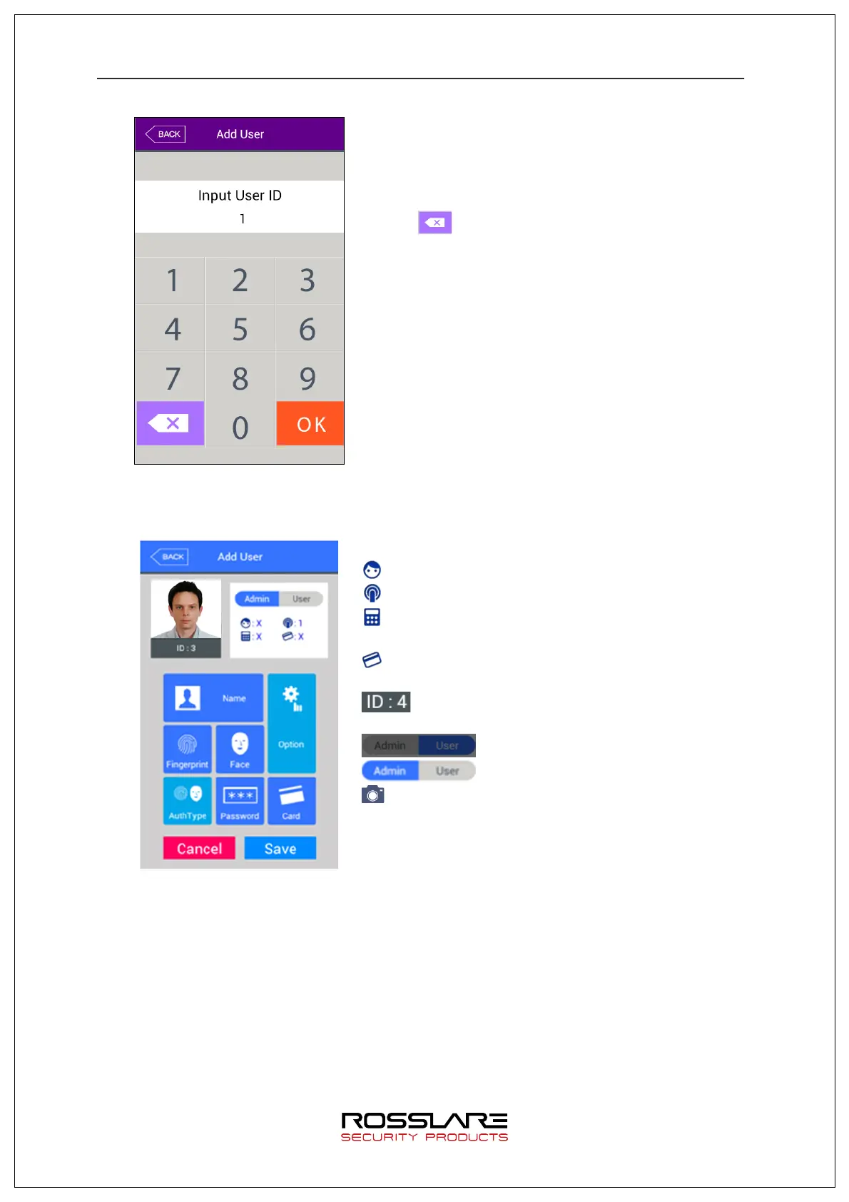 Press [name] to register name, press [Fingerprint] to register fingerprint, press
