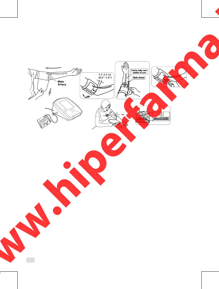 Întoarceţi braţul în sus şi plasaţi capătul manşetei la aproximativ 1.5 până la 2.5 cm mai