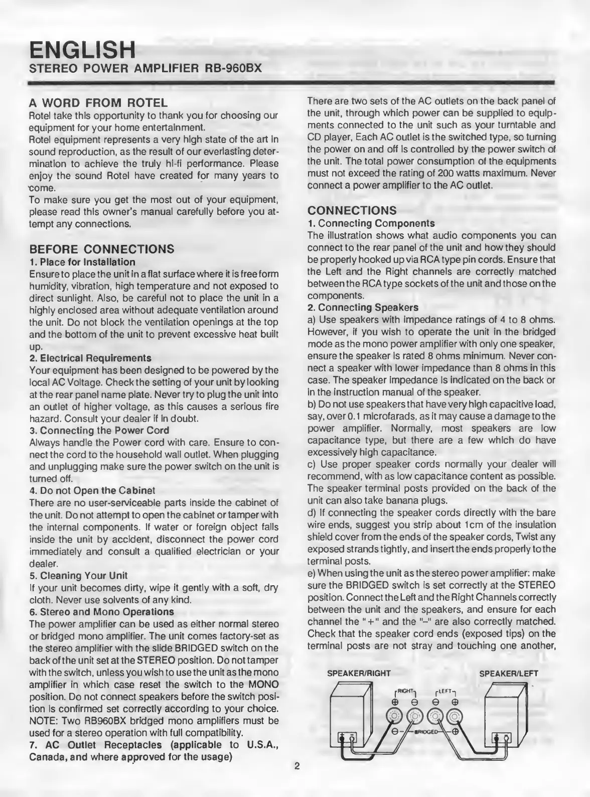 Rotel RB-960BX - A Word from Rotel; Before Connections; Connections; Connecting Components