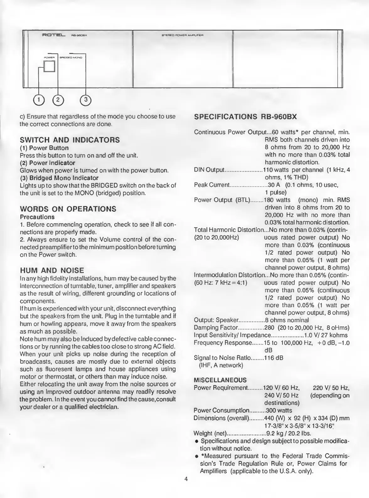 Rotel RB-960BX - Switch and Indicators; Words on Operations; Hum and Noise; Specifications Rb-960 Bx