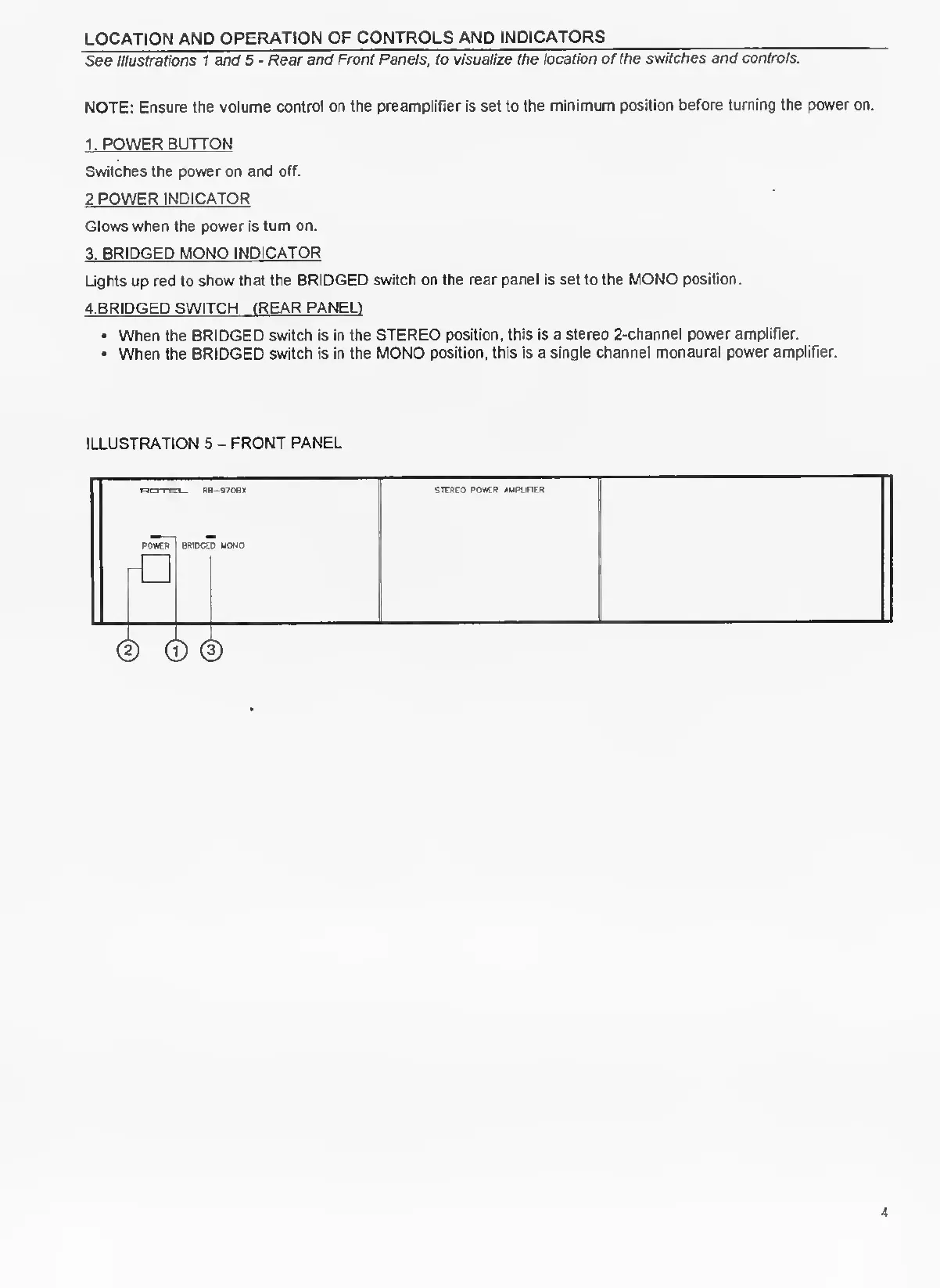 Rotel RB-970BX - LOCATION AND OPERATION OF CONTROLS AND INDICATORS; BRIDGED SWITCH (REAR PANEL)