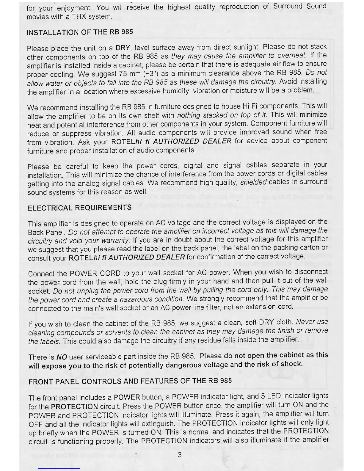 Rotel RB-985 - Installation of the RB 985; Electrical Requirements; Front Panel Controls and Features