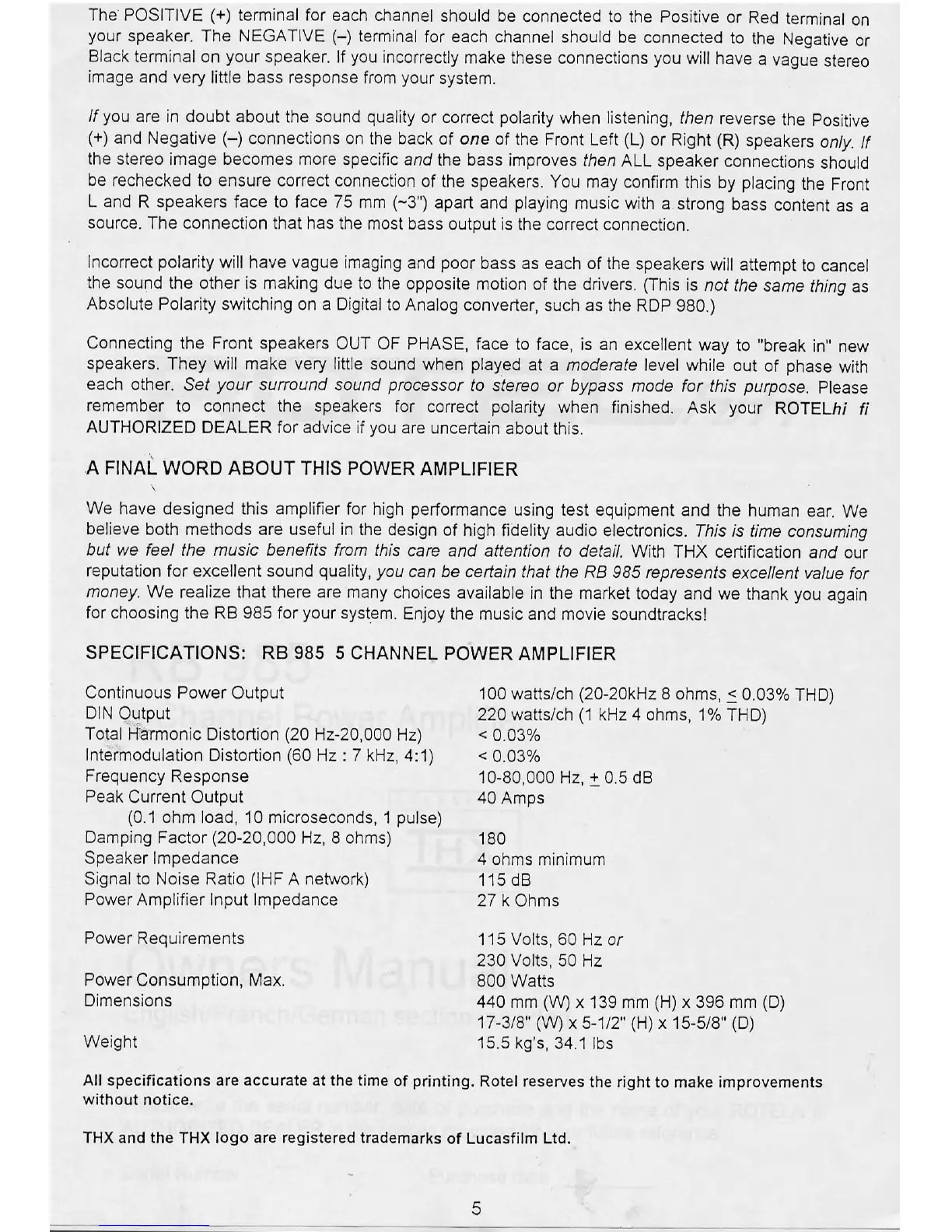 Rotel RB-985 - A Final Word About This Power Amplifier; Specifications: RB 985 5 Channel Power Amplifier