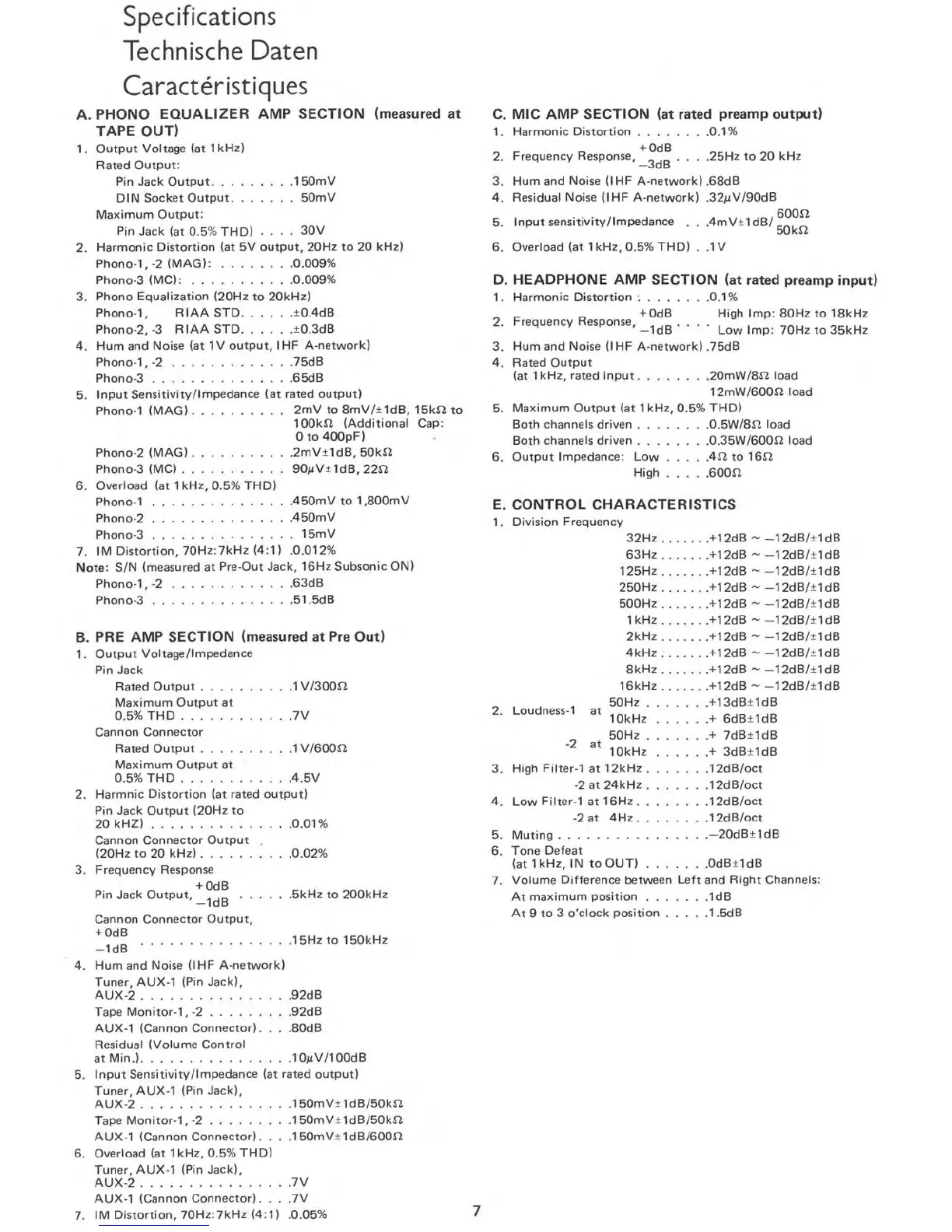 Rotel RC-5000 - Technical Specifications; Phono Equalizer Amplifier Specifications; Pre Amplifier Section Specifications; Microphone Amplifier Section Specifications
