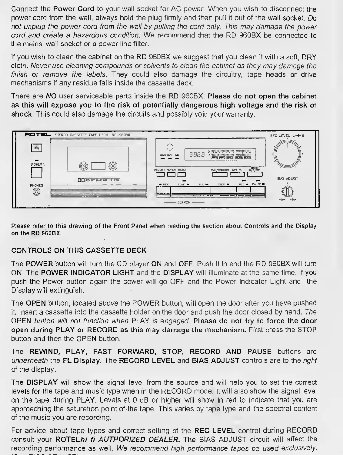 Rotel RD 960BX - Front Panel Controls and Display; Power and Door Operation; Playback and Recording Buttons; Level and Bias Adjustment