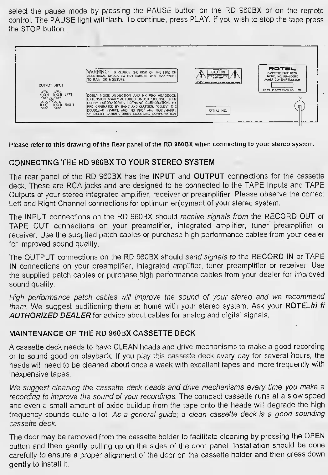 Rotel RD 960BX - Connecting to Your Stereo System; Rear Panel Connections; Cable Recommendations; Maintenance of the RD 960 BX