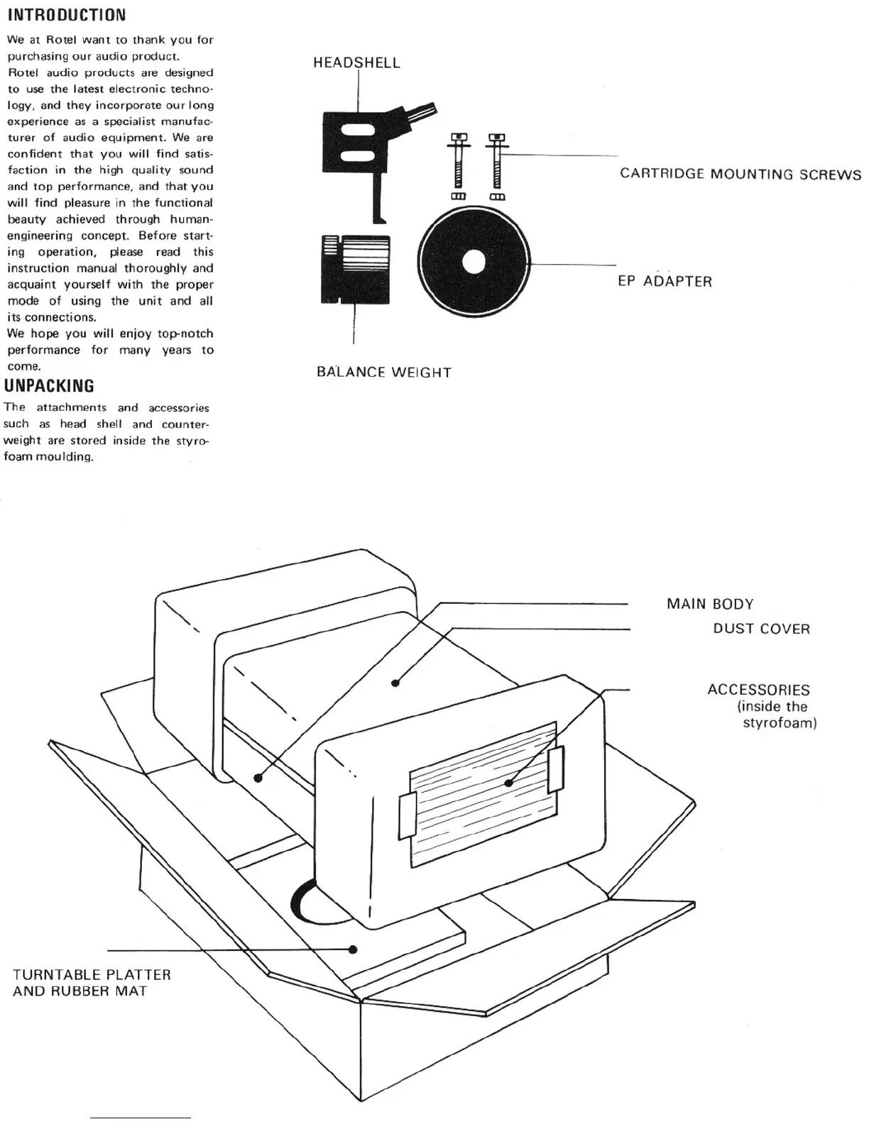 Rotel RP-1010 - Turntable Unpacking and Accessories; Unpacking Procedure