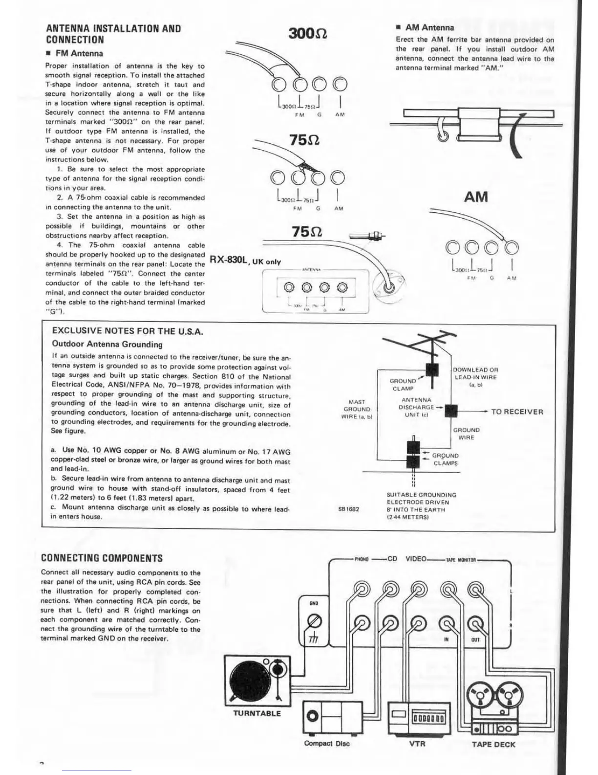 Rotel RX-830 - Antenna and Component Connections; Antenna Installation and Connection; USA Outdoor Antenna Grounding; Connecting Audio Components