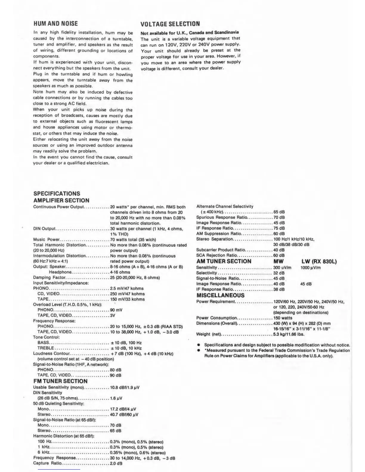 Rotel RX-830 - Hum and Noise Explanation; Voltage Selection and Specifications