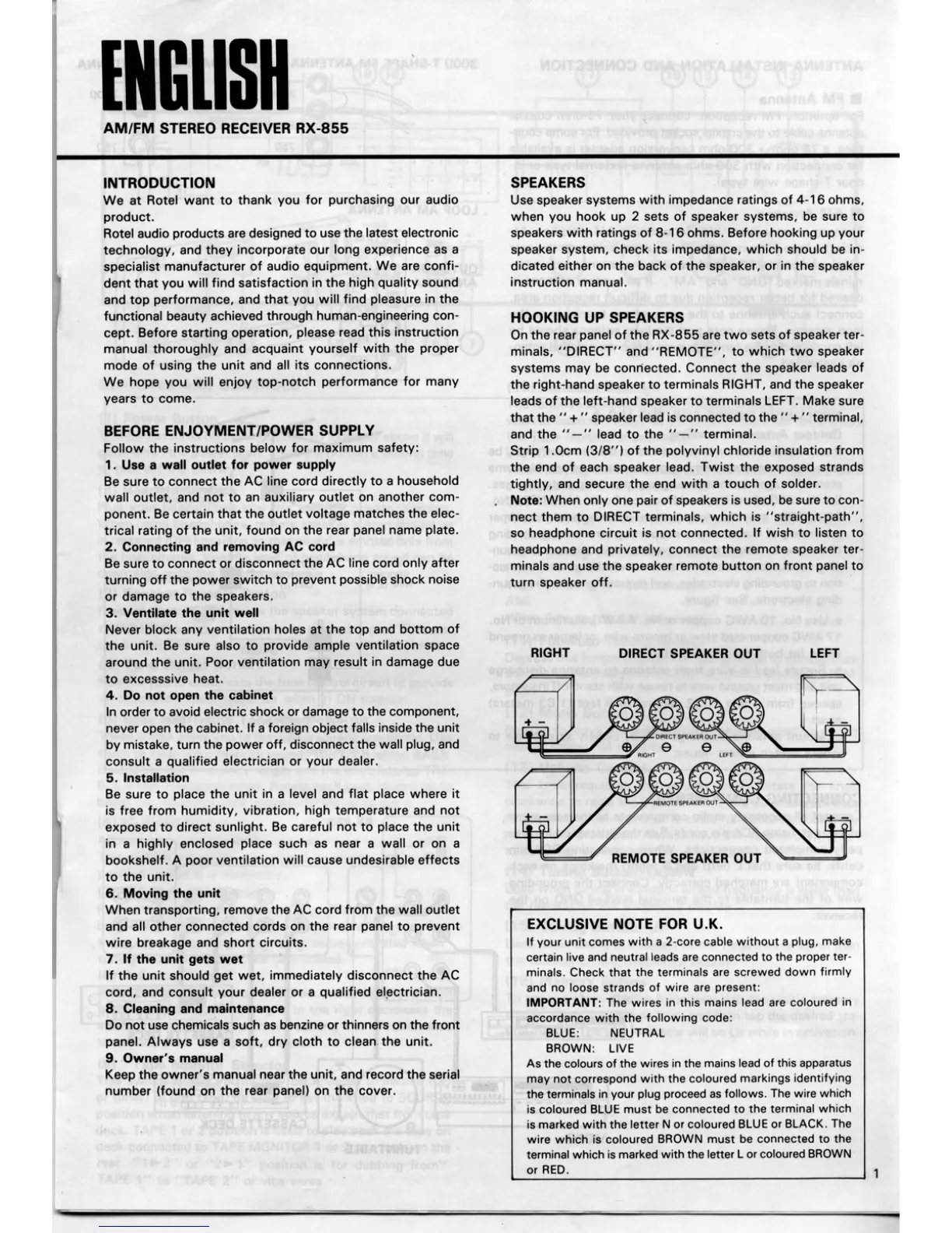 Rotel RX-855 - Before Enjoyment and Power Supply; Use a Wall Outlet for Power Supply; Do Not Open the Cabinet; If the Unit Gets Wet