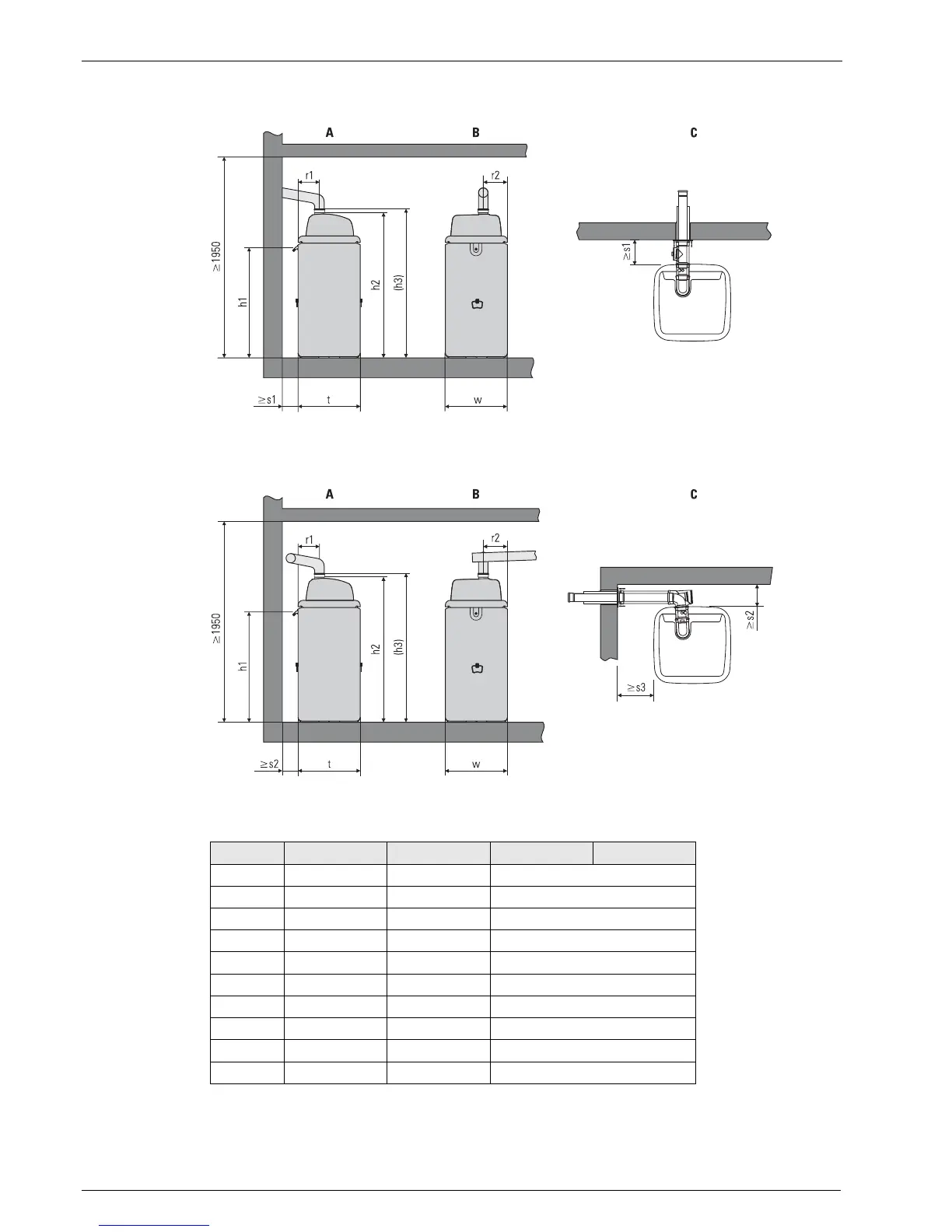 Figure 7-1 Installation dimensions for flue gas connection towards rear (for values, see Tab. 7-1)