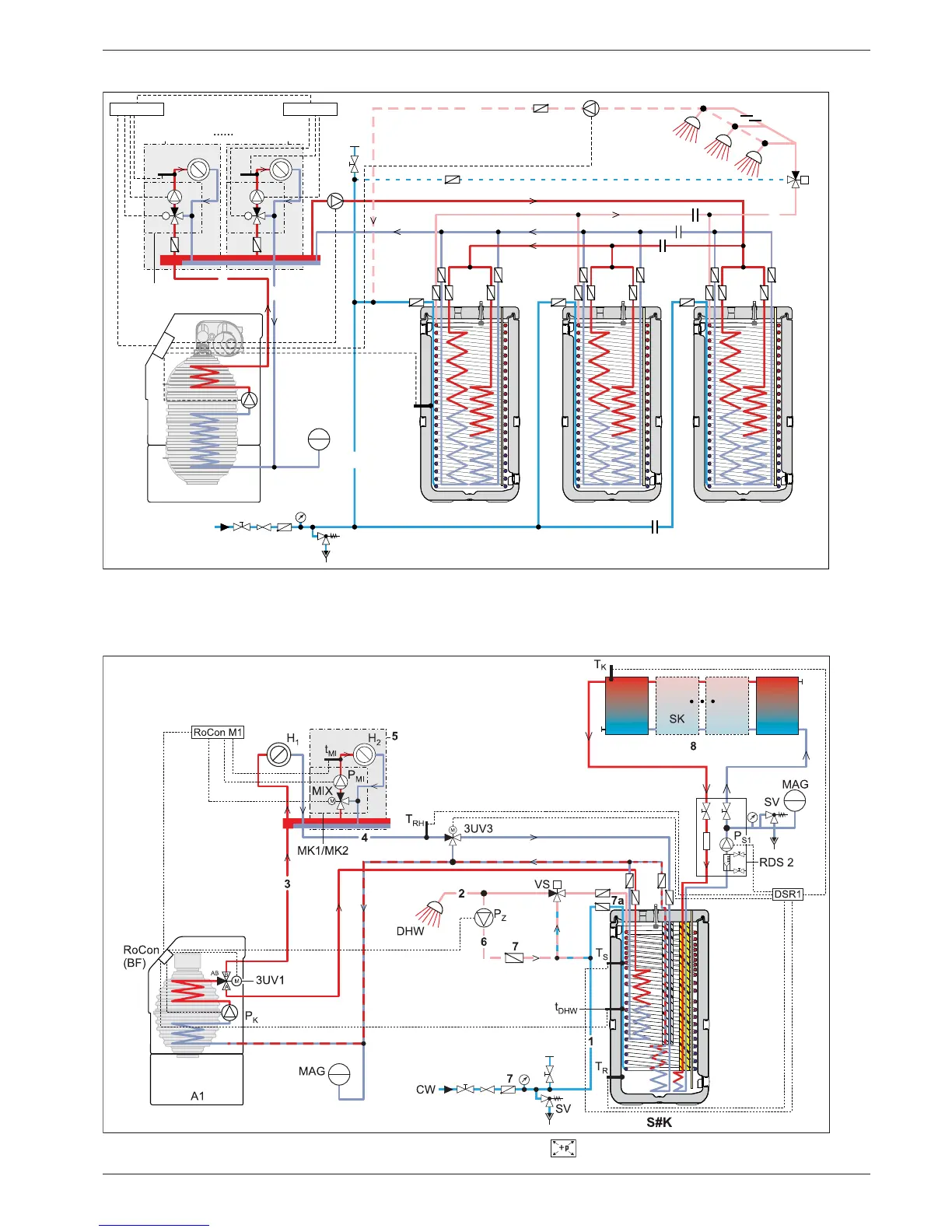 Fig. 7-2 Standard connection schematic for the incorporation of several hot water storage tanks (large installations)