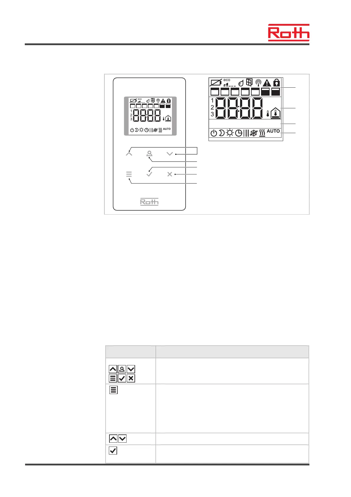 Fig. 7: Overview display and sensor buttons wireless room thermostat