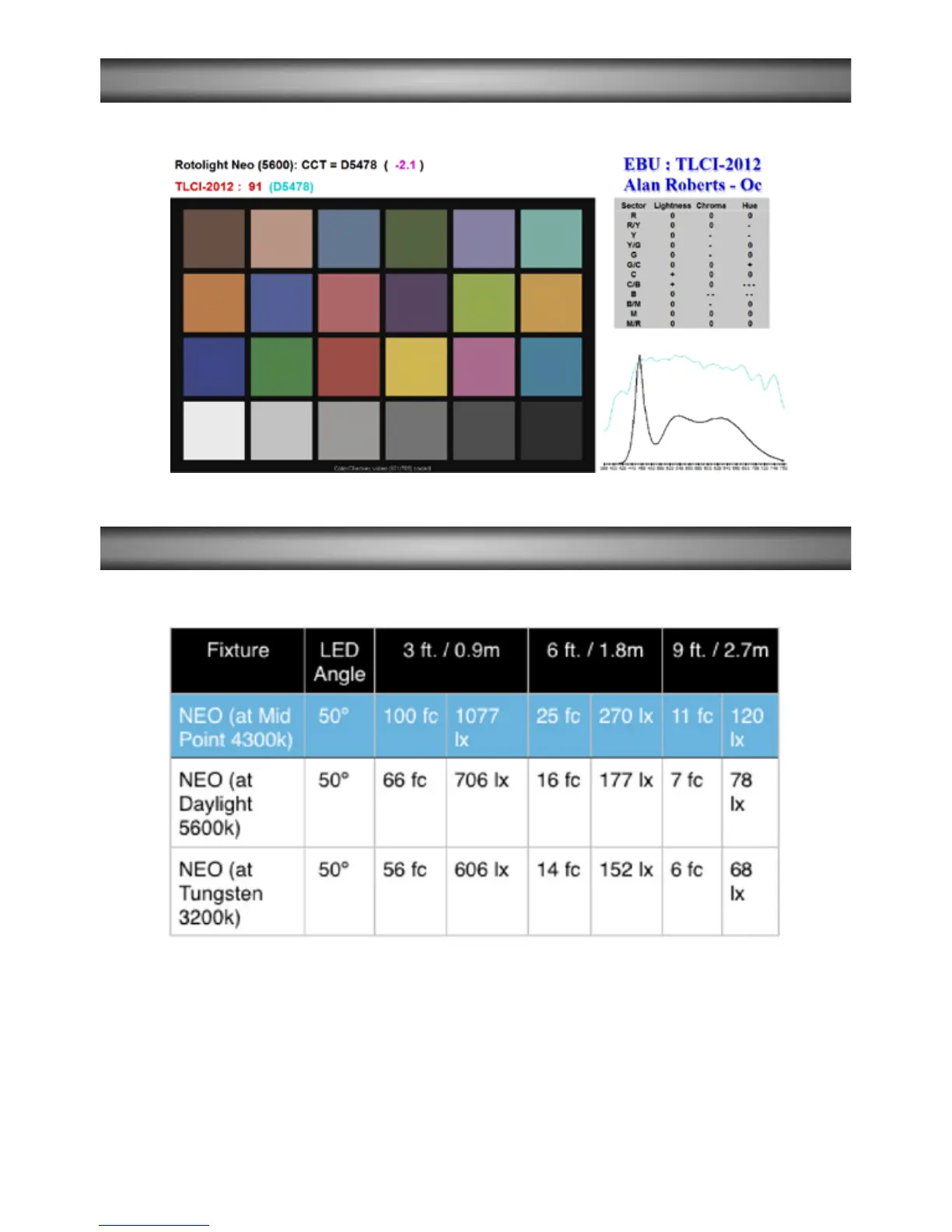Rotolight NEO - NEO TELEVISION LIGHTING CONSISTENCY TEST (TLCI); NEO PHOTOMETRICS CHART; CONTACT INFORMATION