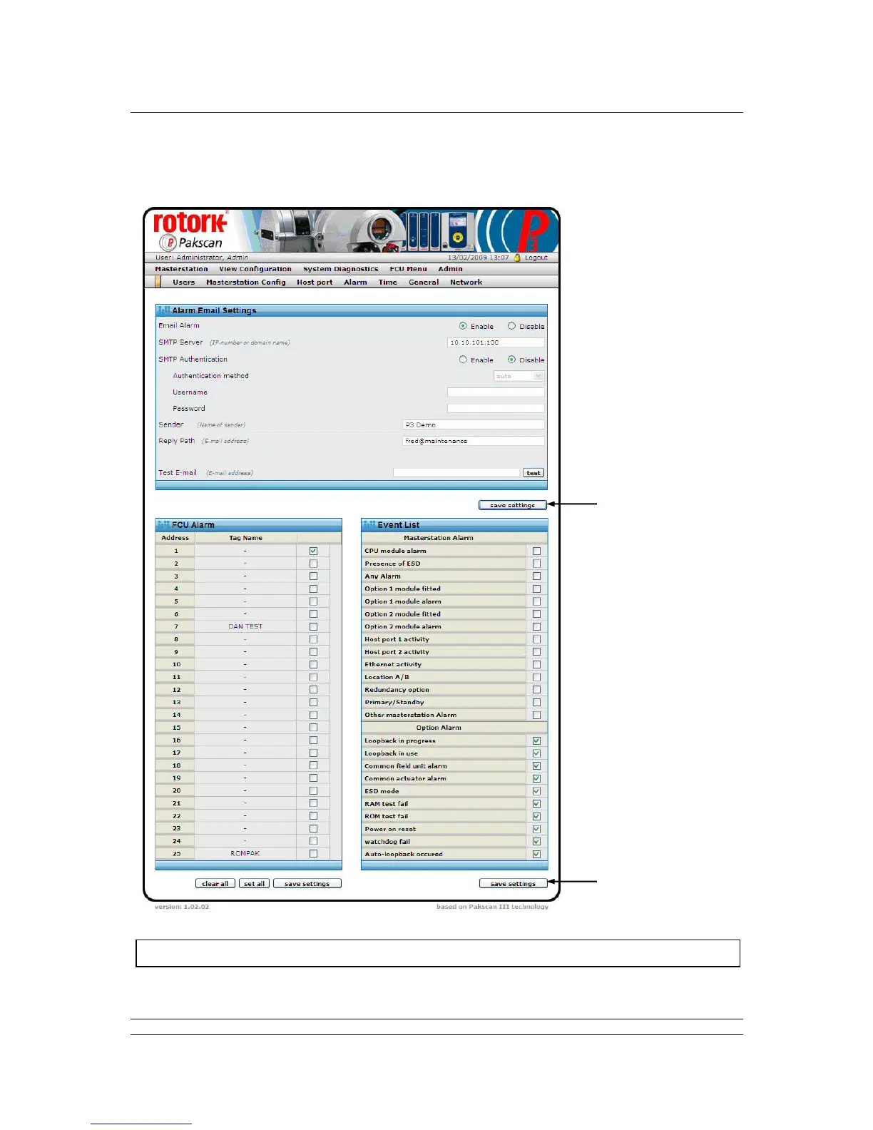 rotork p3 - Alarms; Fig 79: Alarm Reporting Set up Web Page