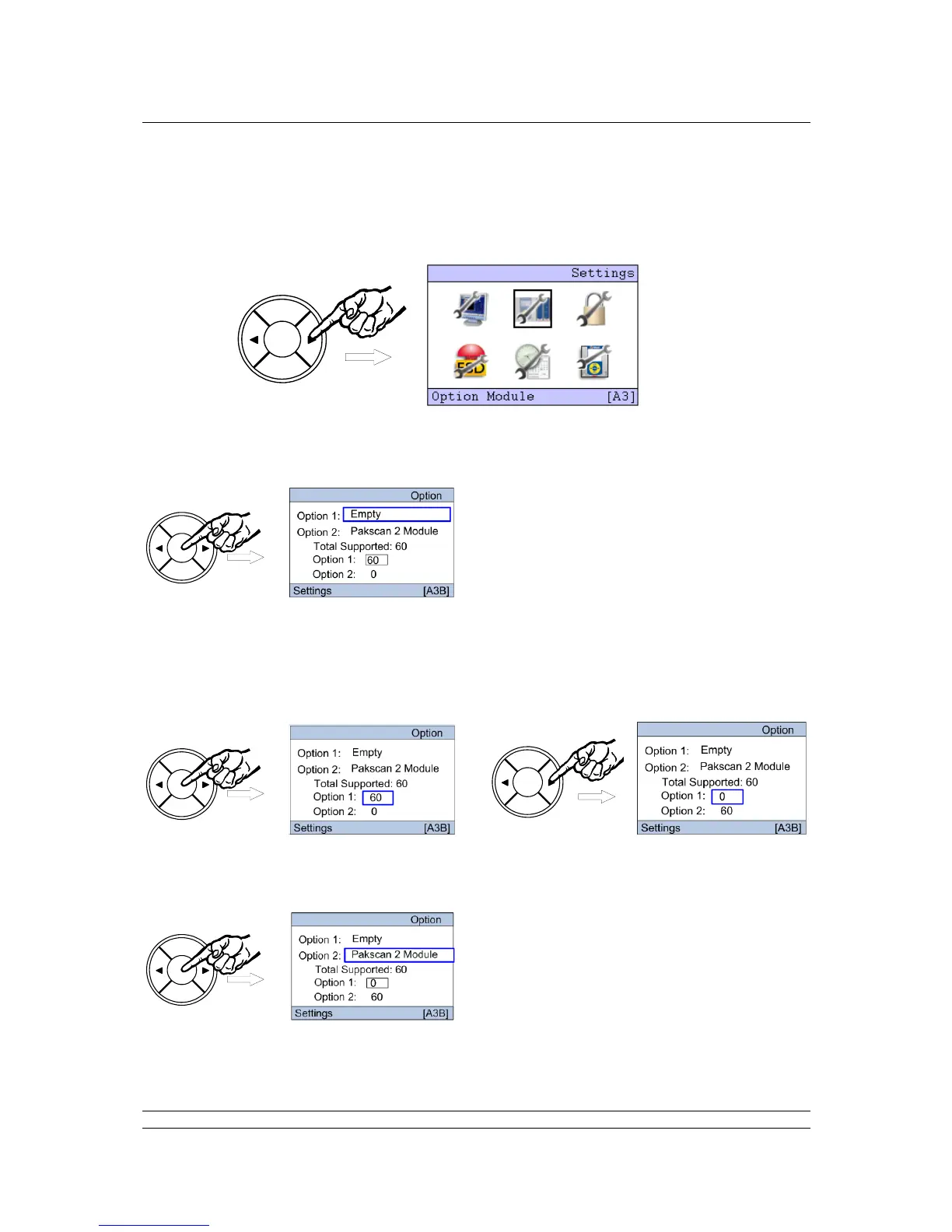 On the ‘Settings’ menu, select the Option Module Icon by pressing the right arrow key () followed by