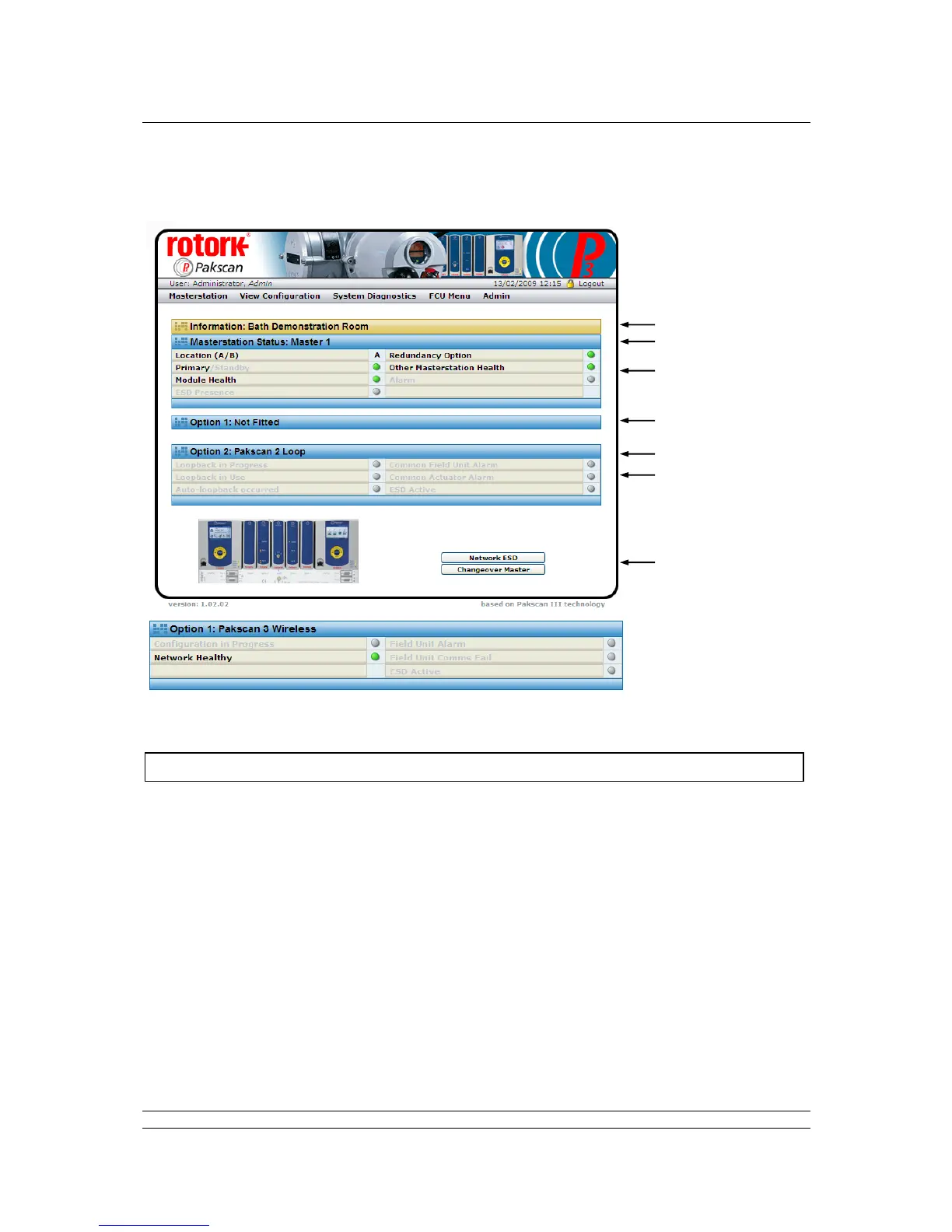 This screen reports the current status of the master station and the option modules fitted. The picture