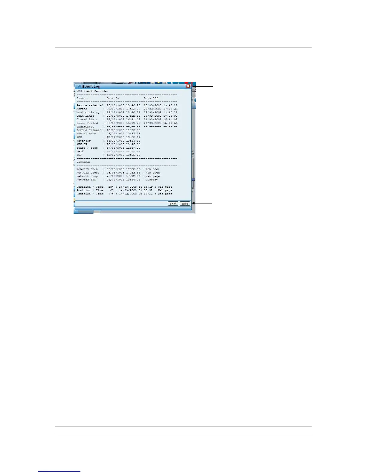 Pop-up screen showing a log of the last occasion on which the various control and alarm