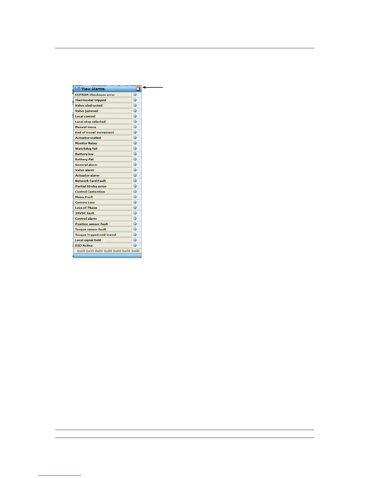Pop-up screen shows the alarms on the actuator as red lights; grey is no alarm. Additional