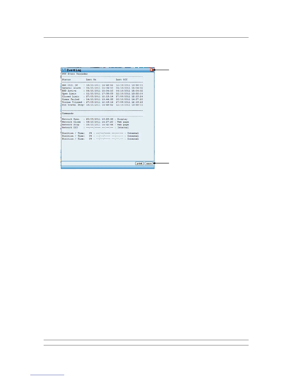 Pop-up screen showing a log of the last occasion on which the various control and alarm