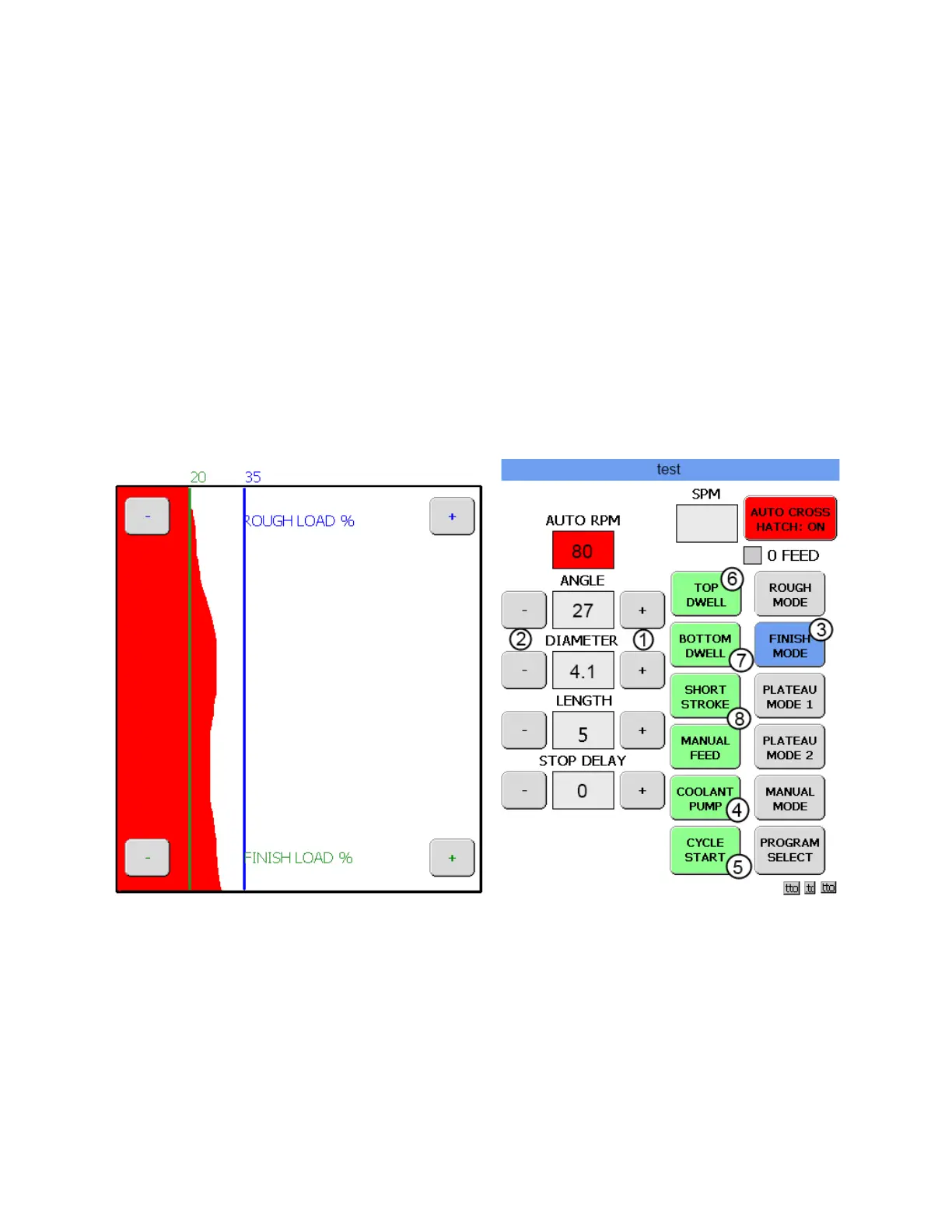 Start the coolant pump (4) and touch the CYCLE START button (5) to begin the honing process. Once the