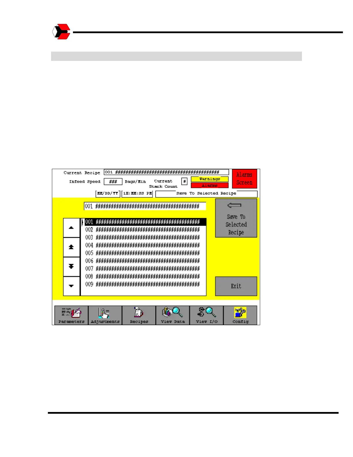 selected recipe. The Operator may also return to the Recipe Management screen