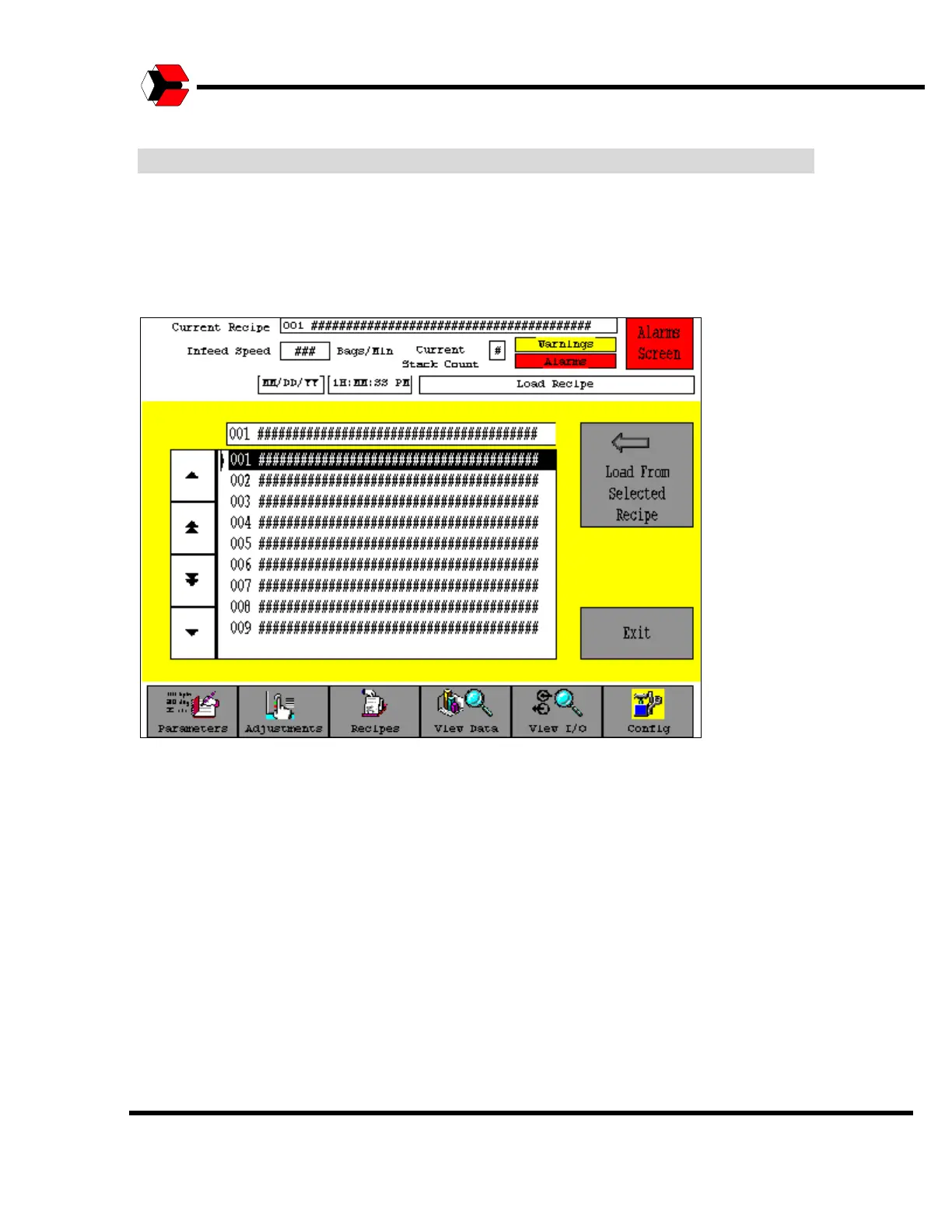 When the Operator selects “Load Recipe”, the Load Recipe screen will appear as