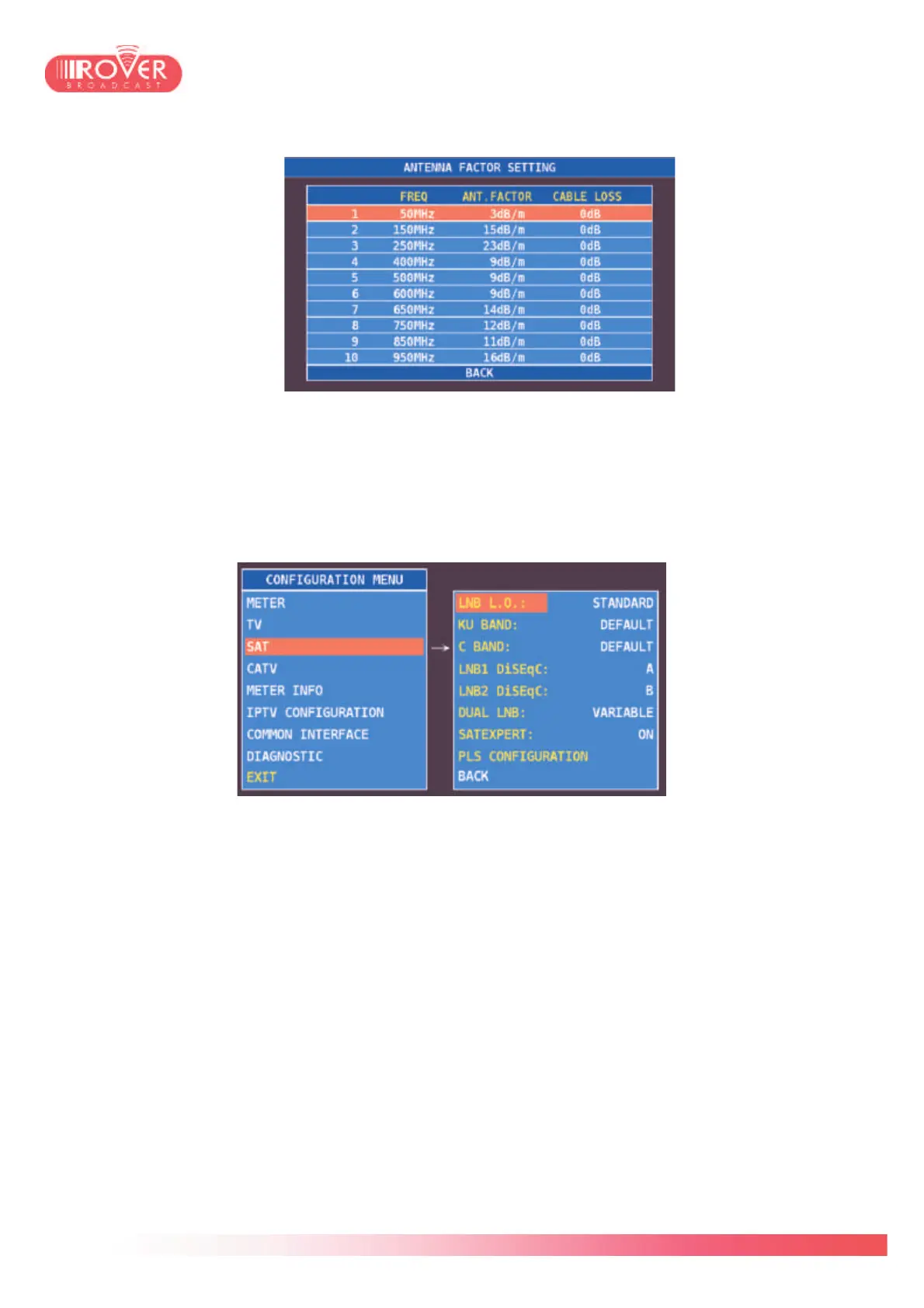 enables the selection of down-converter local oscillator from the 2 subsequent menus, Ku