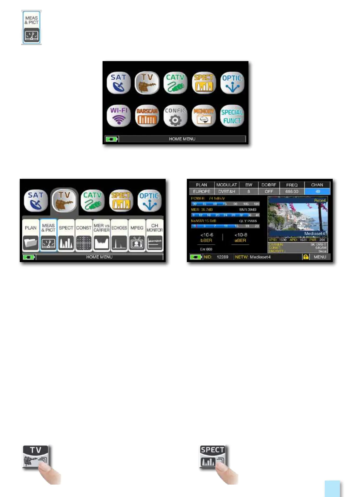 Main menu and image.Touch “TV” and then “MEAS & PICT”