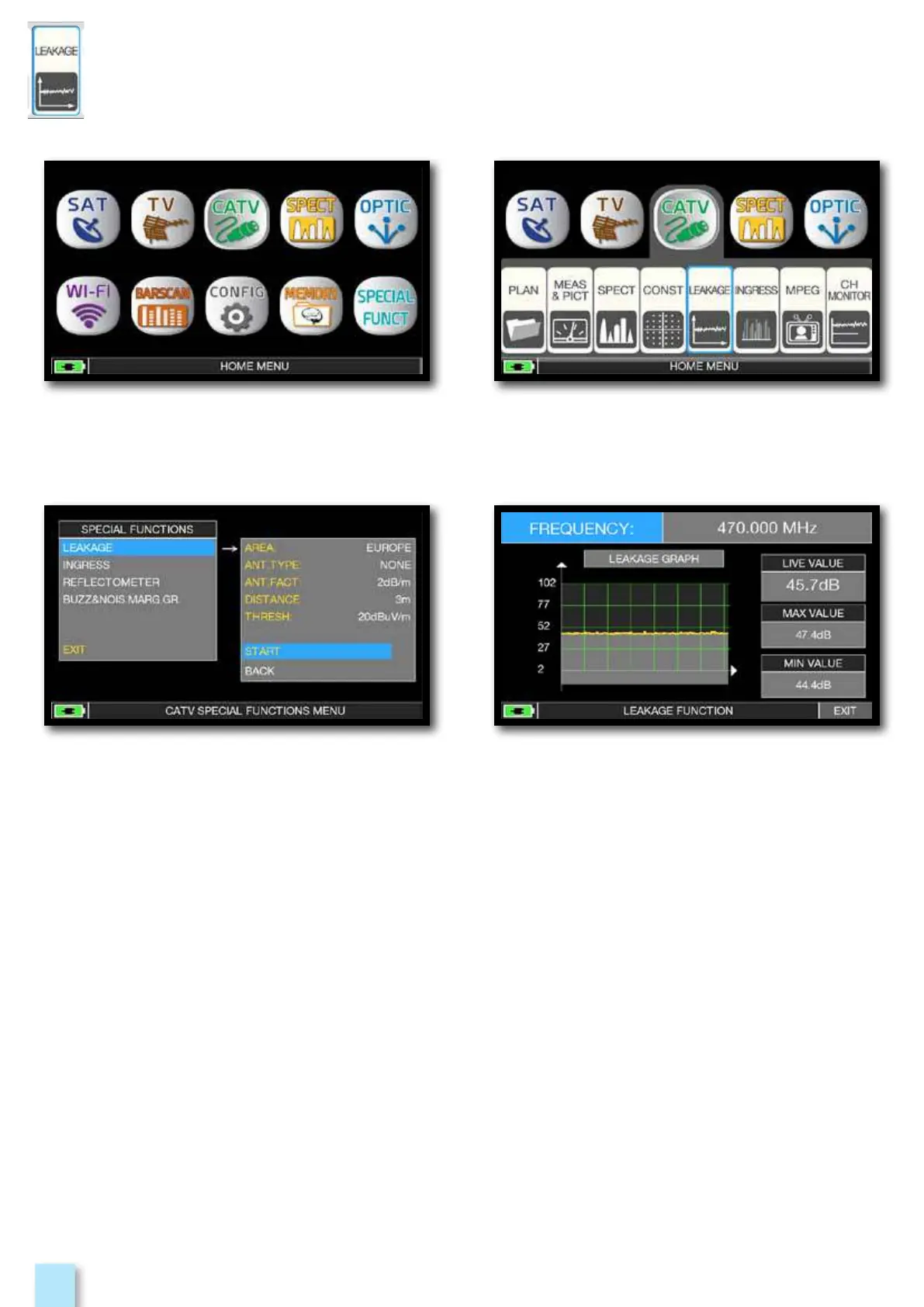 Press the “HOME” key. Touch “CATV” and then “LEAKAGE