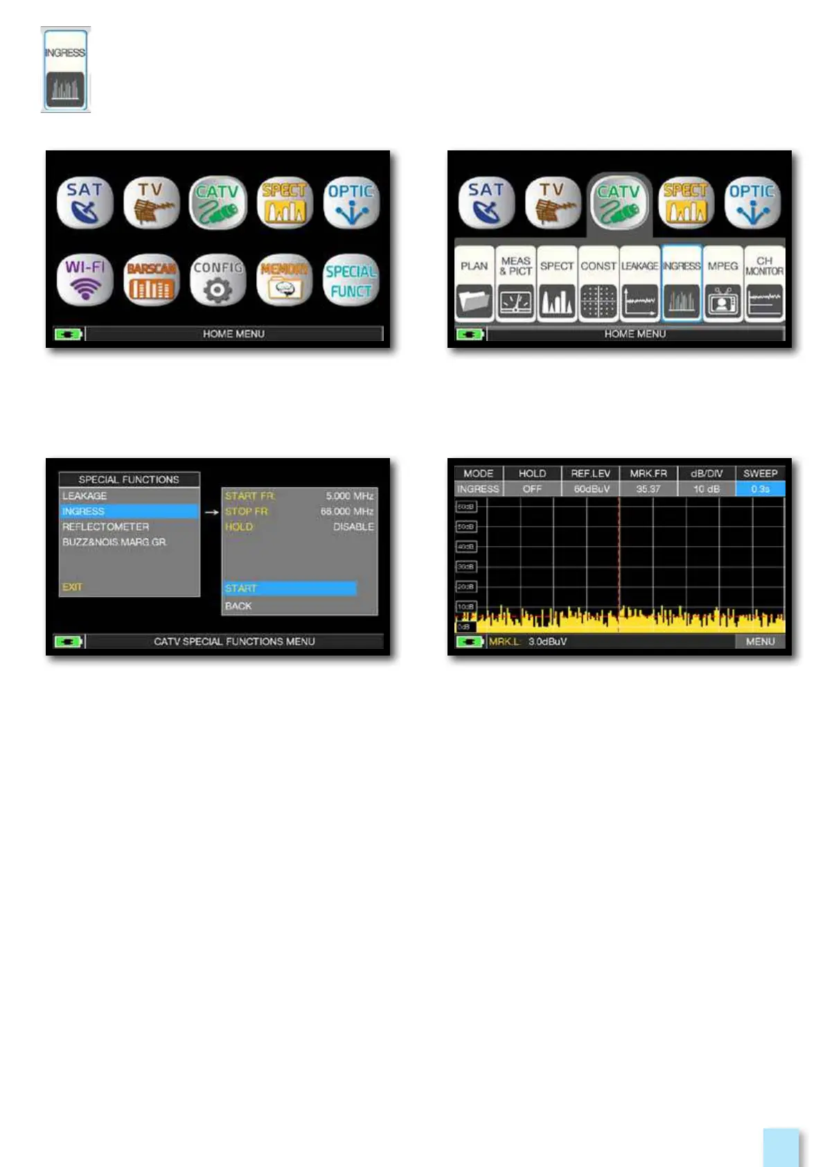 Press the “HOME” key. Touch “CATV” and then “LEAKAGE