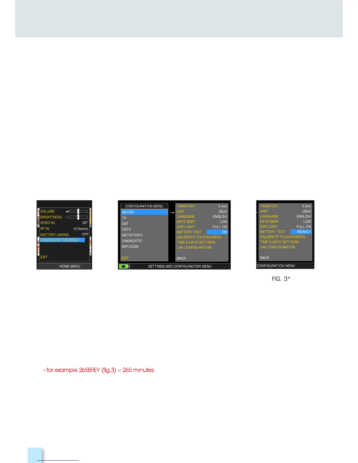 4. To check the battery test results, enter once again into “meter” in the “configuration menu” and read the