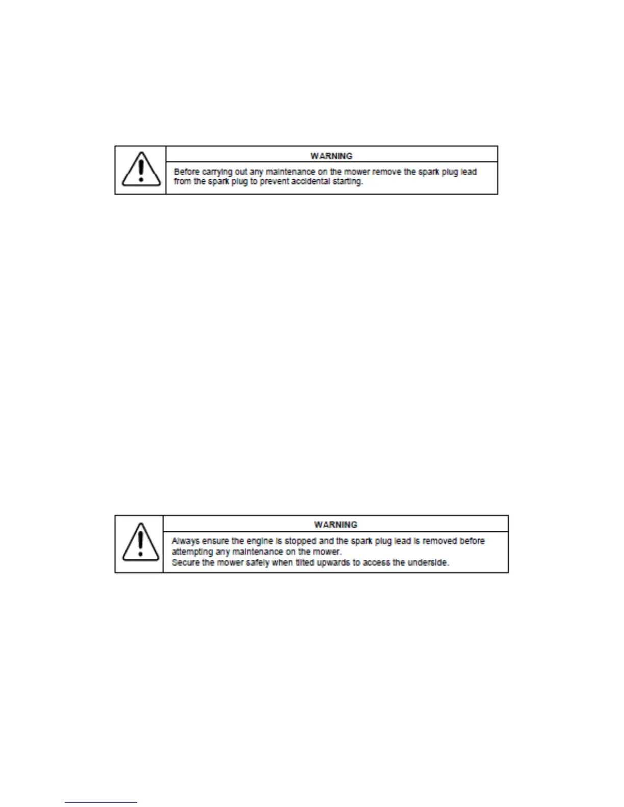 With the engine stopped, remove the spark plug lead and grass catcher or mulch