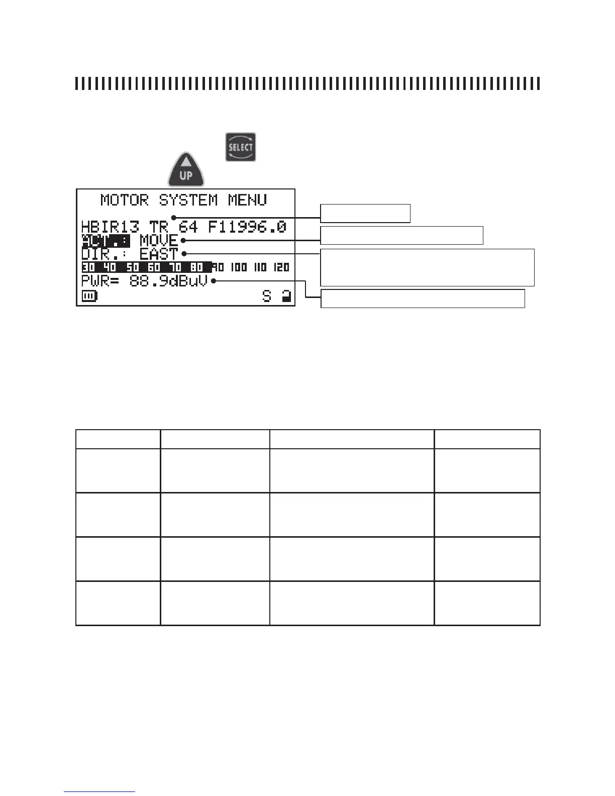 The fi rst display line shows the satellite to which we want to aim the motorized dish (i.e. Hot Bird 13°
