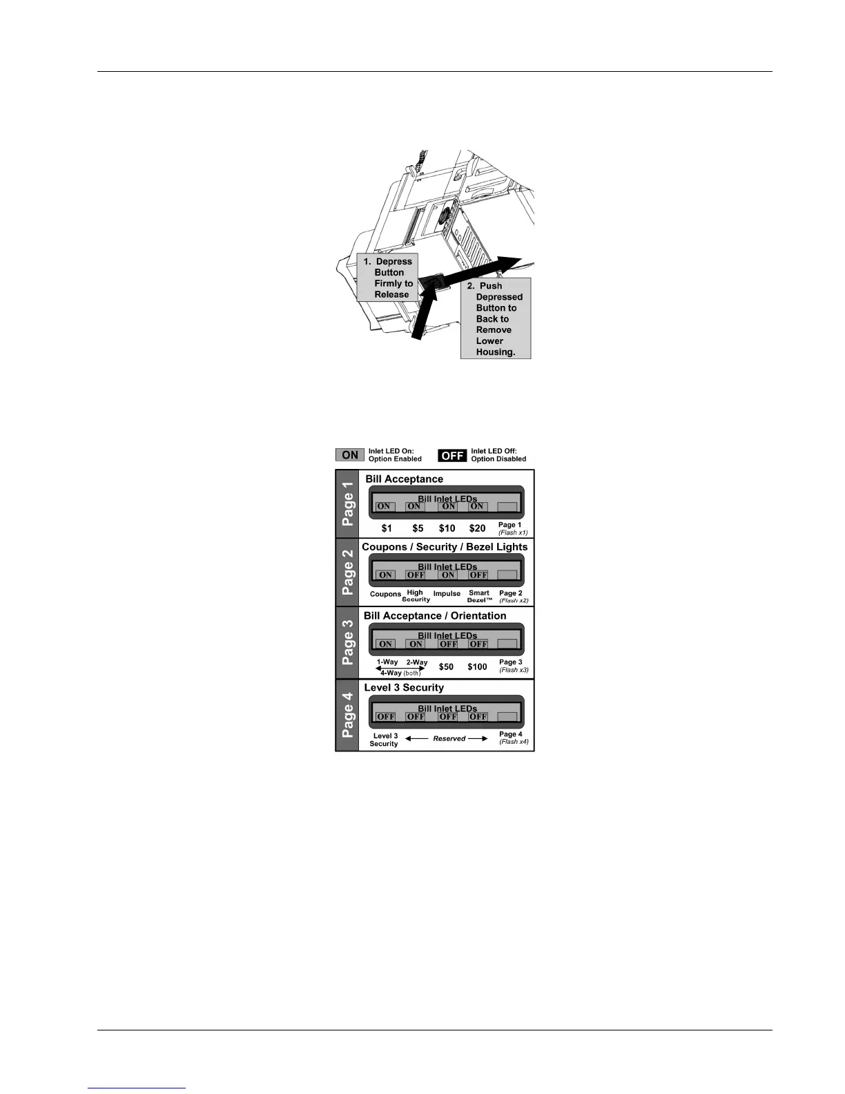 have the bills enabled as desired, press the Service Mode Button and hold it until the Page LED