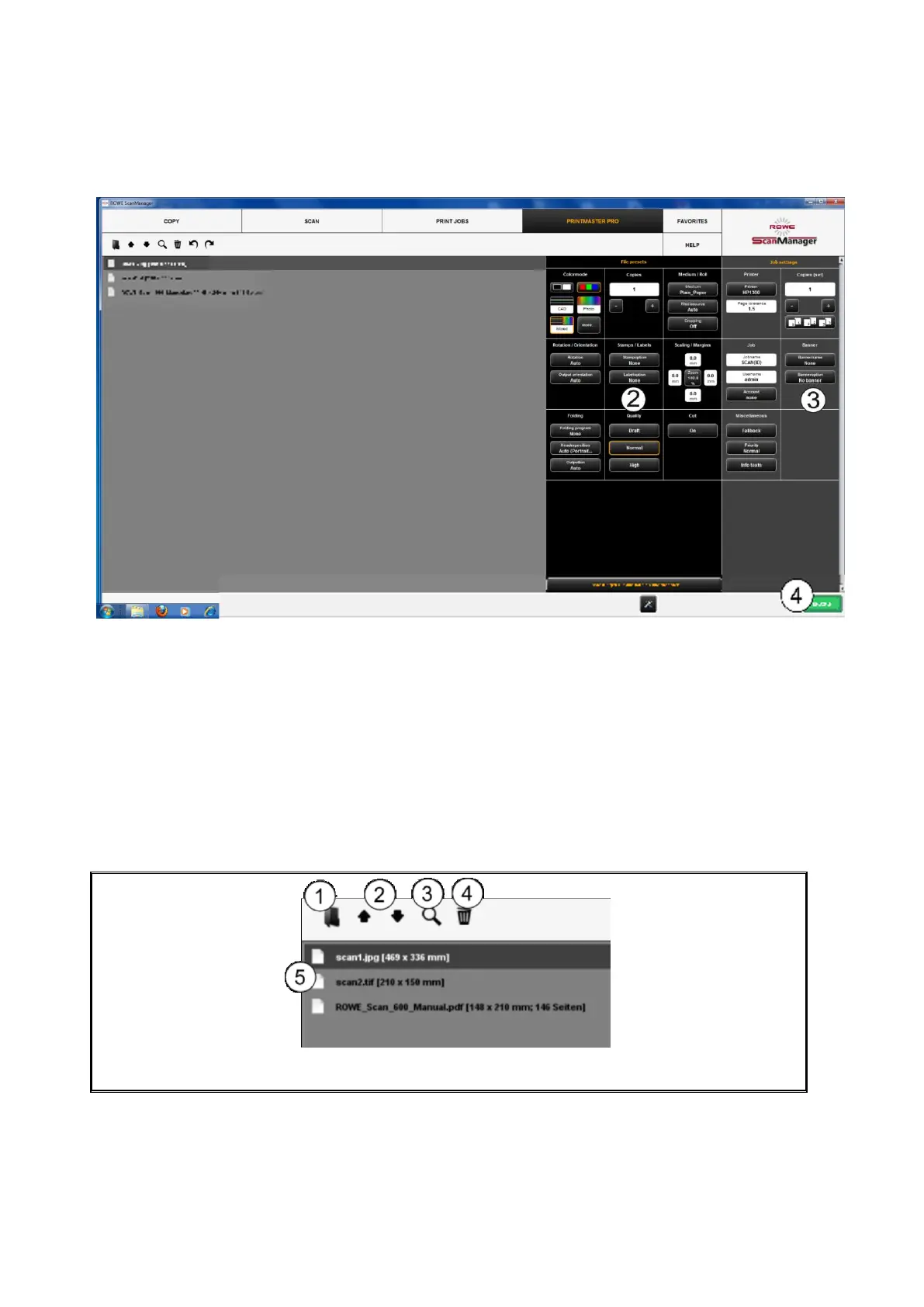 1. File list: List of files added to a print job (see Chapter 5.14.2).