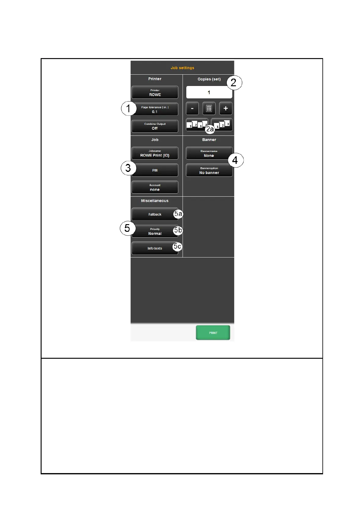 1. Printer: Selection of printer for output of set. With the option Page tolerance you