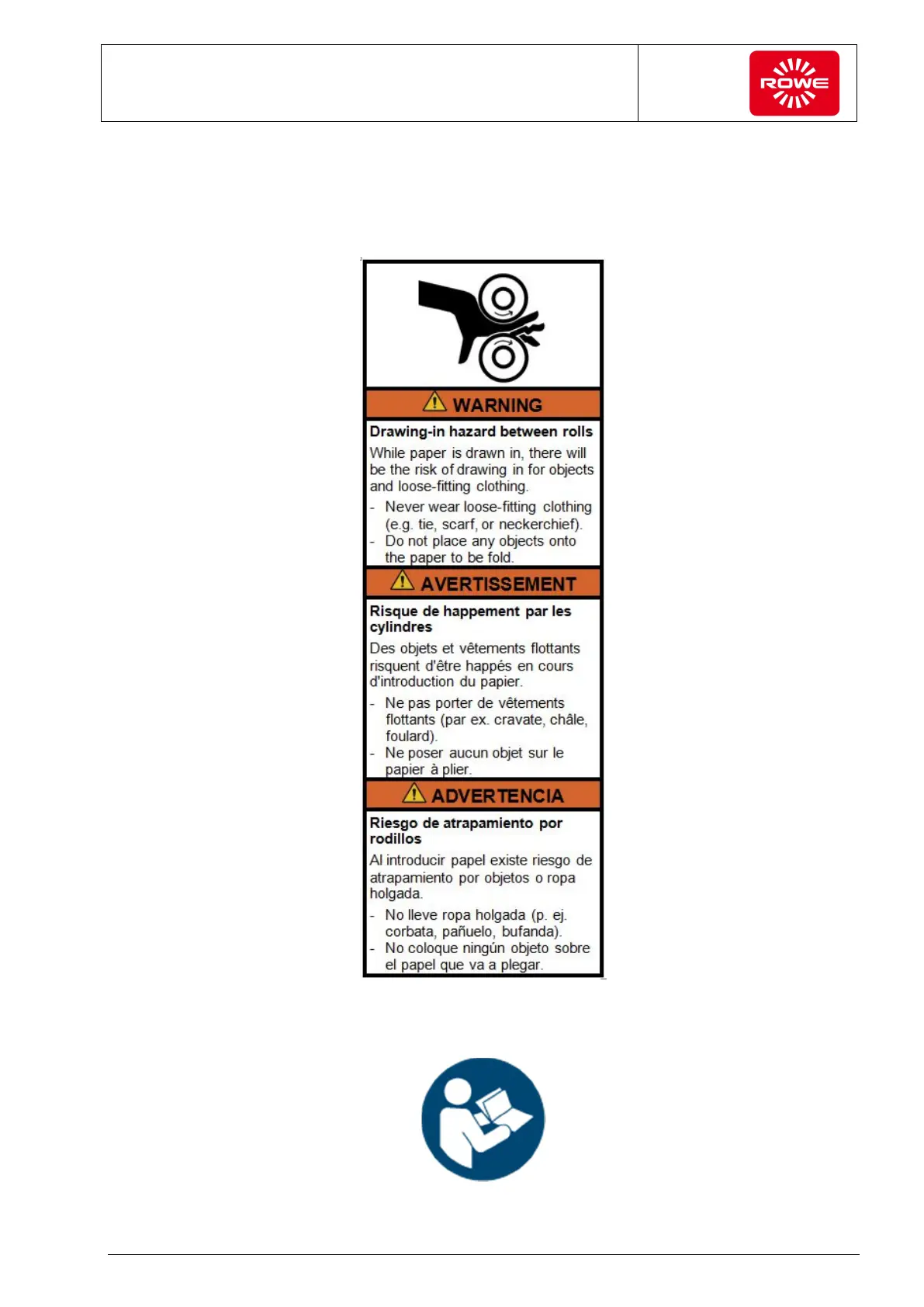 The following warnings are attached to the folding system.
