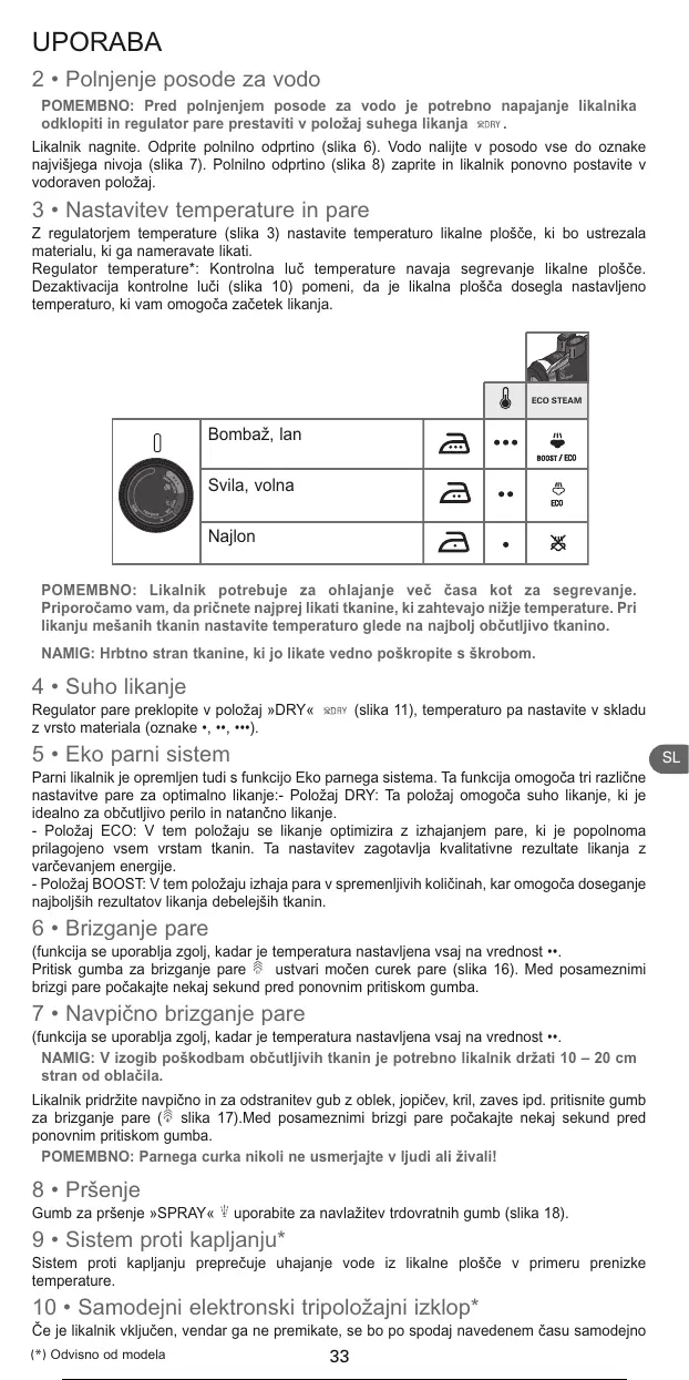 NAMIG: V izogib poškodbam občutljivih tkanin je potrebno likalnik držati 10 – 20 cm