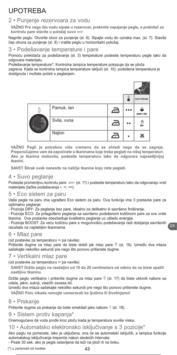 - Pozicija ECO: Za prilagođeno peglanje sa savršeno podešenom količinom pare za sve vrste