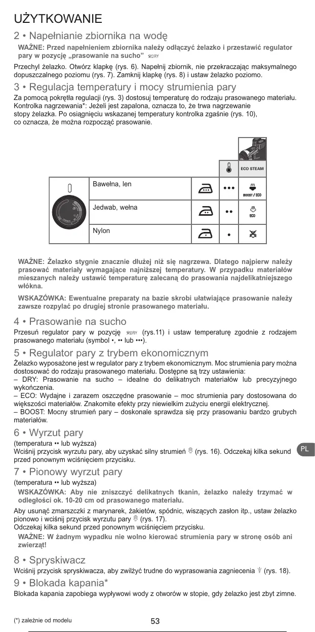 Przesuń regulator pary w pozycję (rys.11) i ustaw temperaturę zgodnie z rodzajem