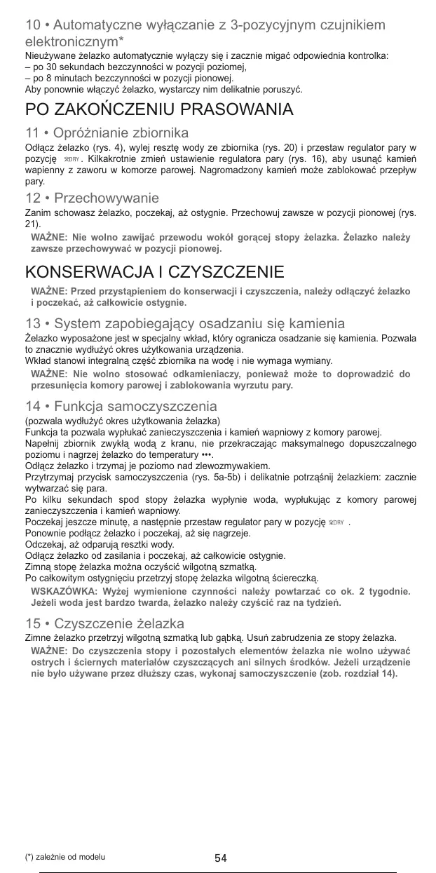 Odłącz żelazko (rys. 4), wylej resztę wody ze zbiornika (rys. 20) i przestaw regulator pary w