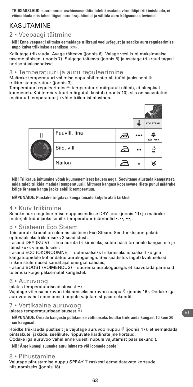 NÄPUNÄIDE. Õrnade kangaste põletamise vältimiseks hoidke triikrauda kangast 10 kuni 20