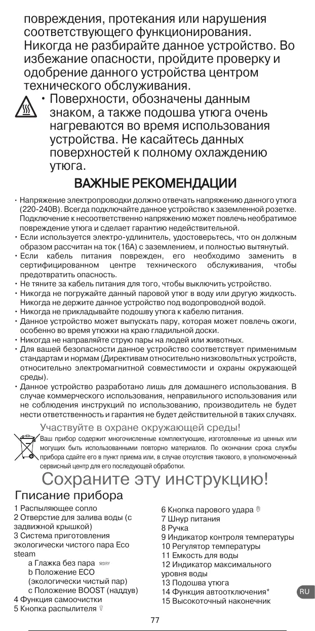 • Напряжение электропроводки должно отвечать напряжению данного утюга