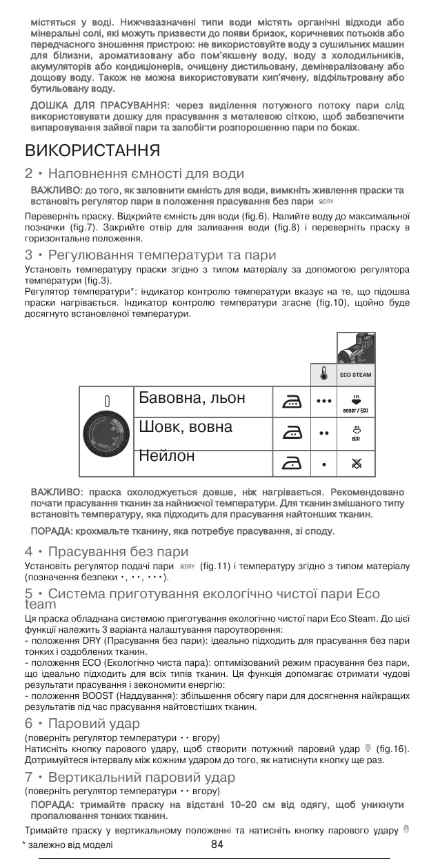 Установіть регулятор подачі пари (fig.11) і температуру згідно з типом матеріалу