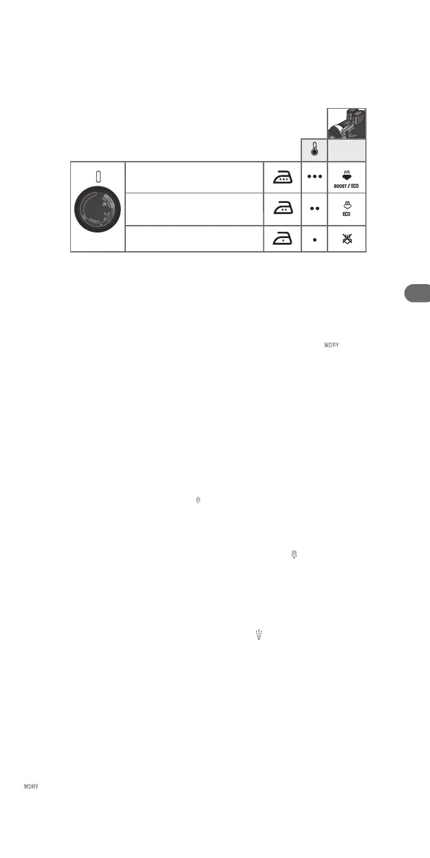 temperaturen indstilles efter stoftypen (priksymbolerne •, ••, •••).