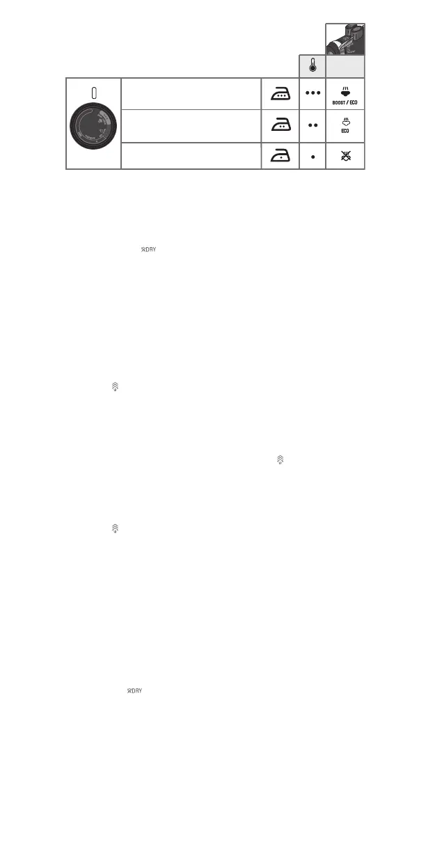 - DRY-posisjon: For stryking uten damp, ideelt for finvask og for å oppnå en perfekt
