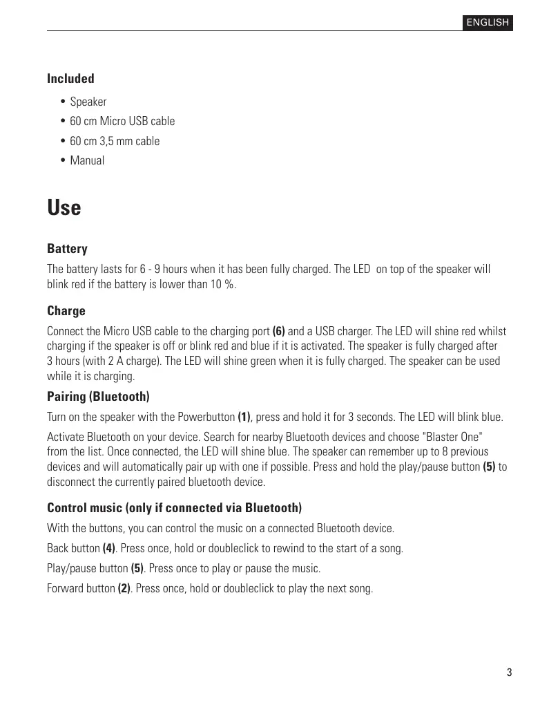 Turn on the speaker with the Powerbutton (1), press and hold it for 3 seconds. The LED will blink blue.