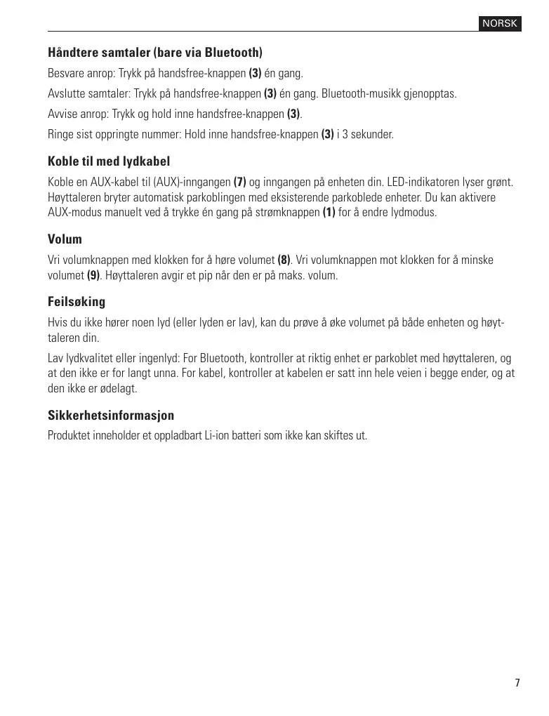 Lav lydkvalitet eller ingenlyd: For Bluetooth, kontroller at riktig enhet er parkoblet med høyttaleren, og